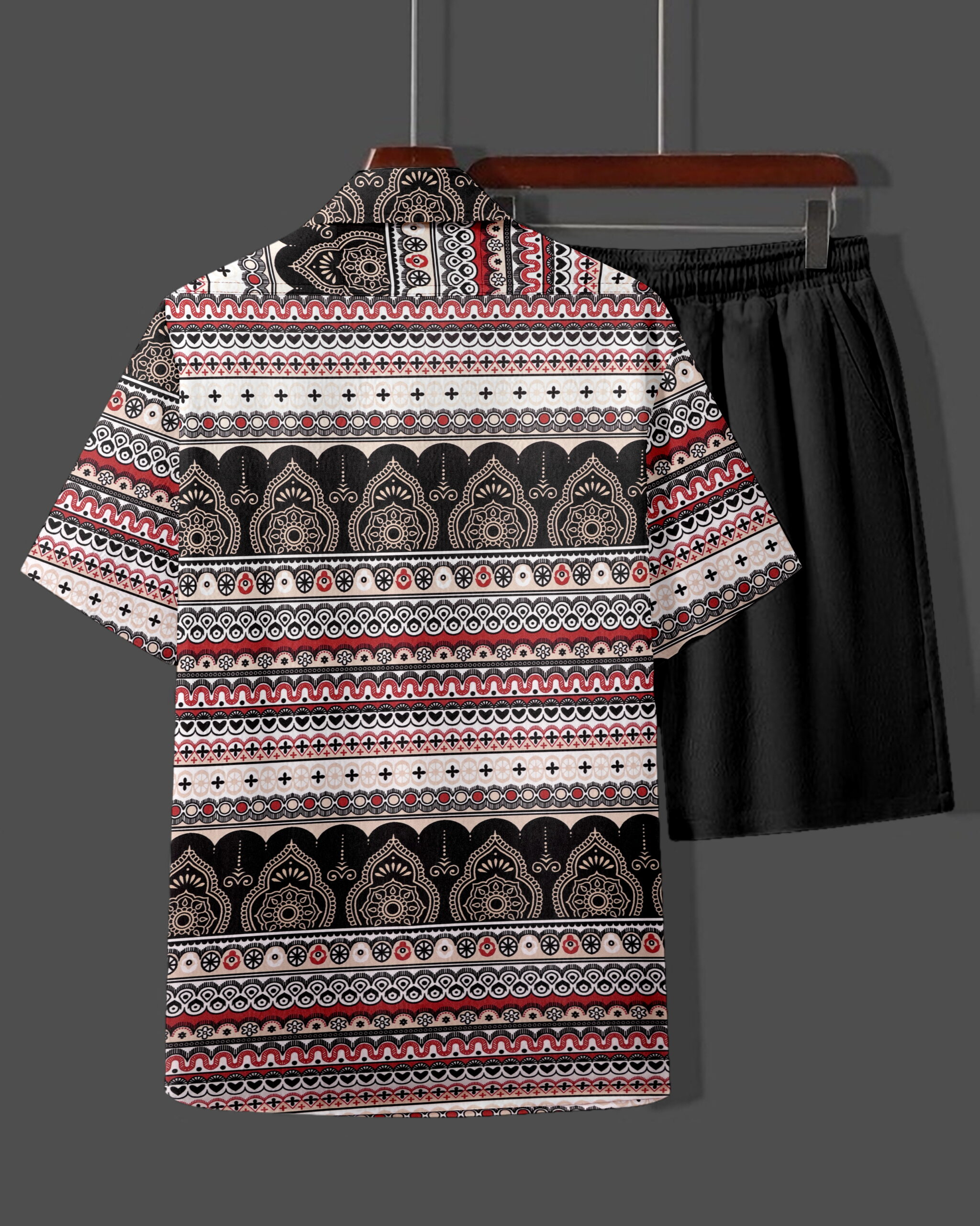 Bring bold energy to your wardrobe with the Black & Red Tribal Co-Ord Set. The vibrant mix of red, white, and black tribal prints on the half-sleeve shirt pairs effortlessly with solid black shorts, giving you a perfect balance of tradition and modern streetwear. Lightweight, breathable, and stylish—this is your go-to outfit for summer outings, travel, or casual evenings.